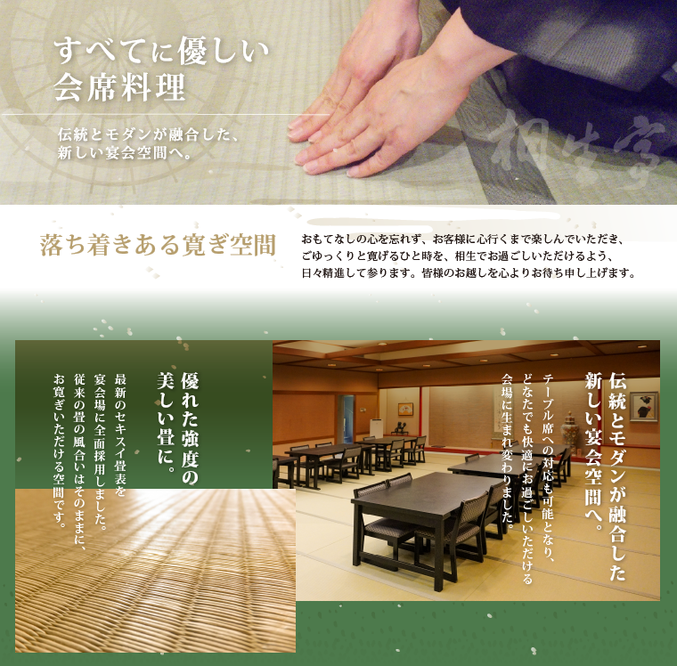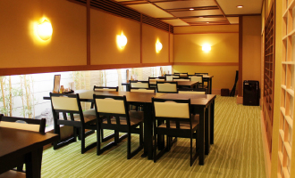 | 本格的な和の体験、畳とお座敷で日本文化を満喫いただけます。お座敷に慣れないお客様はテーブル席を選択いただくことで、快適にお食事をお楽しみいただけます。 |