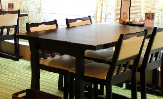 | 立ち座りが楽なテーブル椅子席がご用意できます。高齢者の方の足腰の負担を軽減し、長時間のお食事にも安心。 |